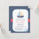 A modern, elegant, classy and trendy invitation for that nautical themed baby shower. Design features a sail boat with polka dots and stripes sail with red and white lifebuoys and anchor on the side. A rope design is used for the border with a knot at the end. Good mix of colours of blue, white, yellow and red. Great for mummy to be who is expecting a baby boy. Personalise easily with party details.