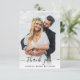 Elegant wedding thank you card featuring your wedding day photo overlayed with "thank you" in a chic script with swashes, and your first names and wedding date joined with a heart. On the reverse side, add an additional photo, personalise your thank you message and add your names in a signature-like script.