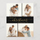 Modern, Minimalist, Elegant „Merry Christmas” Script 4 Photo Collage Christmas Holiday Paper Flyer in black and gold. This festive, clear minimalist, four (4) family photo holiday card template features a pretty grid photo collage and saying „Merry Christmas”! The „Christmas” greeting text script is written in a hand lettered swirly swash tail font type. On the back side one photo and your message. Pretty greeting card for your family and friends in Winter Holiday season.
