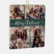 Elegant Modern Script 5 Photo Collage Merry Christmas Green Holiday Ceramic Ornament. Features minimalist five (5) photo collage template a pretty grid collage and „Merry Christmas” saying! The „Merry Christmas” greeting text is written in a beautiful hand lettered whimsical swirly swash-tail font script in white on Green colour background. On the reverse side one photo template. This Ceramic Ornament Cute gift for your family and friends in Christmas Holiday season.
