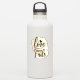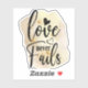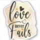 Bible verse "Love never fails" on the background of a watercolor paint splash embellished with faux golden sparkling jewels.