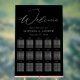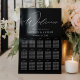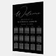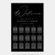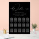 Modern wedding seating chart featuring "Welcome" displayed at the top in an elegant white calligraphy script with a black acrylic background. Personalise the minimalist black and white seating chart with your names, wedding date, and guest names for your 15 tables. The design coordinates with our Modern Elegant wedding collection.