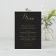 Serve your guests with sophistication using this refined wedding menu. Featuring graceful gold tone script and classic serif fonts set against a black backdrop, it showcases your reception’s courses in an elegant layout. The printed gold look text mimics metallic elegance without the cost of foil, making it ideal for formal, black-tie, modern, or upscale weddings.