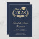 Modern dark blue college graduation party invitation featuring "Class of" in a light gold illustration of a laurel wreath incorporating a grad cap topper and diploma and the graduate's name in an elegant light gold script. Add their school, major, honours or future plans and the graduation party details in simple modern light gold typography.