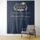 Elegant dark blue graduation party welcome tapestry backdrop featuring "Class of" in a light gold illustration of laurel wreath incorporating a grad cap and diploma, the graduate's name in a stylish light gold script, and "Congratulations" and their school name in modern light gold typography.