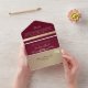 Simple, elegant, minimalist, modern red burgundy all-in-one wedding invitation with romantic gold rope heart and custom picture of the couple at the back.