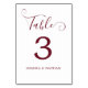 Simple and elegant wedding table number template with modern romantic script element, editable table number and custom wedding name in deep burgundy. The text is printed equally on the front and back of the card. The minimalist design of these table number cards will add a stylish touch to your wedding table decorations without dominating them. © y.BEE WEDDINGS