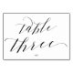 Simple Elegant Calligraphy Script Wedding or Dinner Party Table Number Three written out in beautiful flowing fancy letters. A stylish yet simple formal design in black and white or any background colour you choose. Just click the customise further link, shown under the text personalisation area on the right, and choose your custom colour background. This sign poster template makes it fast and easy to create stunning additions to your wedding decor. Signs can be enlarged, there are many sizes to choose from, as well as options for custom framing and matting. Welcome to our wedding custom signage.