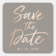 This Save the Date sticker can be personalised with your wedding date. The design features a faux rose gold foil brush script font on a grey background.