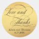 A beautifully elegant thank you sticker for wedding favours, correspondence and more, this design features a beautiful calligraphy script font with flourishes over a gold background. Edit with your names and wedding date or other desired text.