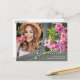 A unique custom photo graduation announcement postcard, featuring design elements of elegant handwritten style script with modern text. The graduates photo is enhanced by beautiful pink flowers with a sage green background. The back of the card offers personalised text spaces for information about the graduation and future journey. To see more items like this, visit my store here at "www.Zazzle.com/LakeViewCardCo". Thanks