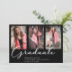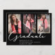 Black graduation party photo invitation with an elegant script font and 3 photos on the front. The back is black with white text, but completely customisable with Zazzle's design tool.