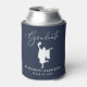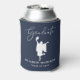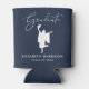 Custom dark navy blue can cooler for her graduation party featuring an illustration of a graduate celebrating in her cap and gown, "Graduate" in an elegant white script and her name and class year in simple white typography.