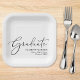 Elegant white graduation party paper plates with "Graduate" in a chic modern script and the grad's name, school and class year in simple typography.