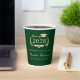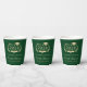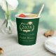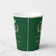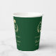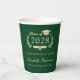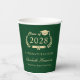 Elegant green and gold graduation party paper cups featuring "Class of" in a laurel wreath with a grad cap and diploma, the graduate's name in a formal script, and "Congratulations" and their school name in classic modern typography.
