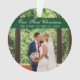 Elegant Stylish Script Our First Christmas Wedding Photo Green Ornament with Snowflakes back