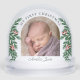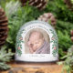An elegant keepsake photo snow globe to commemorate baby's first Christmas. The simple design offers winter greenery and elegant script text. Personalise with your favourite photo of your newborn. Photography © Storytree Studios, Stanford, CA