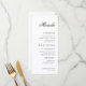 Elegant wedding menu featuring a stylish script name at the top for a personalised touch. Designed to double as a place card and menu, it’s perfect for wedding receptions, rehearsal dinners, or engagement celebrations. The minimalist black and white layout with refined typography creates a timeless detail that complements modern, chic, or classic table settings while guiding guests through your dining experience.
