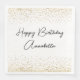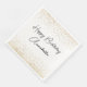 These event or party napkins feature an elegant, classic theme on a white background. The greeting, "Happy Birthday" is printed in a black script font across the centre, followed by a sample name in a matching script font. You can personalise the plate to include your own custom name or other text. Gold glitter confetti accents the top and bottom portions of the napkin.