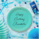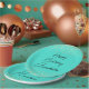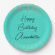 These event or party plates feature an elegant, classic theme on a turquoise or teal coloured background. The greeting, "Happy Birthday" is printed in a black script font across the centre, followed by a sample name in a matching script font. You can personalise the plate to include your own custom name or other text. Gold glitter confetti accents the top and bottom portions of the plate.