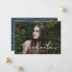 Elegant graduation announcements featuring the graduate's horizontal photo with "Graduate" in white script lettering. Personalise the front of the photo graduation announcement by adding the graduate's name, school name, and graduation year. The announcement reverses to display a navy and white hand-drawn stripe pattern.
