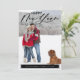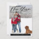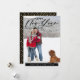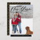 Elegant black typography, "Happy New Year" photo overlay, New Year's Card. Template provides single photo on front with single template line for your name//year in simple framed label at bottom. Back of card features faux gold foil dotted pattern on black background.