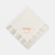 Ecru Napkin with elegant script in a bright orange (ff6600) hue. Brilliant, eye-catching colour that makes you think of the 1980s. A great addition to any retro-themed event. Enhance your name with stylish swashes. Simply place it between the symbols provided in the personalisation section.