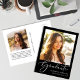 Celebrate your graduate with this black graduation announcement postcard featuring "Graduate" in an elegant white script, her photo and her name, school and class year in simple modern white typography.