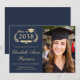 Announce a proud academic achievement with this elegant dark blue college graduation announcement, featuring a portrait of your graduate, a timeless laurel crest with a grad cap mortarboard and diploma encasing their class year, and classic gold script and serif typography -- creating a traditional look that feels polished and enduring. The clean design showcases the graduate’s name, university, degree, and class year in a clear, sophisticated format -- perfect for sharing milestone news with family and friends. Fully customizable, this graduation announcement allows you to adjust it for a high school graduate as well.