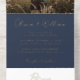 Elegant dark blue all-in-one wedding invitation featuring your photo on the top flap, your first names, "Reception to follow" and "Rsvp" showcased in a chic calligraphy script, your invitation details in classic serif typography, and a white tear-away RSVP postcard, with all inside text rendered in your choice of genuine gold, silver or rose gold foil. You can adjust the size of the script for longer or shorter names by editing in the design tool.