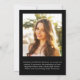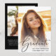 Announce your grad's achievements with this stylish black graduation announcement. Her favourite photo fills the card with "Graduate" written on top in an elegant script. Underneath, add her name, school and class year. On the back, add an additional photograph and a personalised message in modern white lettering.