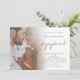 Elegant Script Photo QR Code Engagement Invitation. A modern minimalist design. Simply replace the sample photo with your own favourite. A gradient overlay layer is on top of your photo so it fades out as it reaches the centre with the text partially overlaid on top. Engagement is in a modern set script and easily personalise the rest of the text. With parties in mind taking place in a hotel or restaurant (or any venue with a website), replace the QR code on the back with a QR code to their website. You can create QR codes for free online. Simply search “QR code creator” and lots of options come up to create for free. You can also delate the QR code and text on the back if not required via customise further.