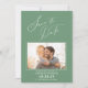 Announce your upcoming wedding with this beautiful photo save the date card. The design features a horizontal photo frame on the front accented with elegant script "Save the Date" on a sage green background. Add your wedding website to the backside.