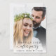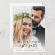 Elegant elopement or small wedding announcement and reception invitation to let family and friends know that you were married in a small intimate wedding ceremony, and to invite them now to a wedding reception. The front features your wedding day photo overlayed with "Happily Ever After Party" in a mix of simple typography and a trendy script with swashes. Under your photo, add your first names and wedding date. On the reverse side, personalise your message in more detail and add party or reception details and your names in a signature-like script.