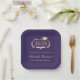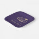 Elegant purple graduation party paper plates featuring "Class of" in a gold illustration of laurel wreath, a gold grad cap and diploma, the graduate's name in a stylish gold script, and "Congratulations" and their school name in classic gold serif typography.