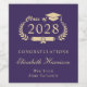 Elegant purple graduation party wine labels featuring "Class of" in a gold illustration of laurel wreath, a gold grad cap and diploma, the graduate's name in a stylish gold script, and "Congratulations" and their school name in classic gold serif typography.