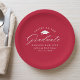 Elegant graduation paper plates featuring a graduation cap with the phrase "Cheers to the Graduate" in a white calligraphy script on a red background. Personalise the modern graduation paper plates with the graduate's name, school name, and graduation year. The simple graduation plates are perfect to use for your high school or college graduation party.