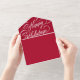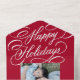 This unique holiday photo card design features a festive red background with a beautiful calligraphy script greeting in white with two photos. The inside of the card accommodates text and two photos, one large and one small horizontal photos. On the outside of the card is your return address. The photo is torn away and can be kept as a keepsake! Also, there is need to order envelopes - the outside of the card serves as an envelope!