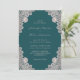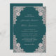 These elegant rose gold and teal wedding invitations featuring rose gold floral lace on a dark teal background are perfect for inviting your guests to your teal and rose gold rustic wedding party.