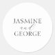 Elegant Script Simple Black & White Wedding Classic Round Sticker. Modern design with elegant black script on classic white. Suitable for weddings of any season, day or night, great for favours and thank yous. All text fonts, and colours are customisable. We invite you to visit our Zazzle store, Austen & Grace, for matching products and more. Please contact us if you require any assistance.