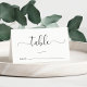 Elegant wedding table number place card with "table" in a stylish calligraphy script with swashes and blank lines for you to fill in the table number and the name of your guest. On the back, add your first names joined by a heart and your reception date.