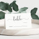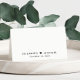 Elegant wedding table number place card with "table" in a chic calligraphy script with swashes and blank lines for you to fill in the table number and the name of your guest. On the back, add your first names joined together by a heart and your reception date.