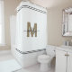 Personalised Custom Elegant Script White Gold Monogram Name Feminine Shower Curtain. This chic shower curtain adds a luxurious touch to any bathroom with a custom monogram design on a crisp white background. Featuring a bold grey initial letter and a flowing black script name, the design is accented with double white stripes at the top and bottom for a refined detail. All colours are fully customisable to match your style and bathroom decor. Perfect for weddings, housewarmings, or birthdays, this monogrammed shower curtain blends style with practicality, adding timeless elegance to your space.
