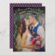 This Happy New Year photo card design shown for a newlywed couple features a portrait photo from the wedding day with a stylish white custom text overlay design and scroll frame. The back of the card features a deep purple background colour that can be modified with a white arrow pattern.