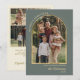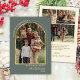 Elegant Gold Arch 4 Photo Season's Greetings Green Happy Holiday Card. Celebrate the season in style with this elegant family photo Christmas card featuring a modern gold colour arch-shaped photo frame. Personalise it with your favourite family photos, family name, and the year on neutral on sage green background. The festive minimalist design is highlighted with elegant faux-gold colour Season's Greetings typography, creating a warm and timeless look. The back showcases 3 photo collage with gold border and holiday message template with hand lettered names on cream white or off white background. A perfect holiday card to share with family and friends in winter holiday season.