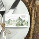 Watercolor landscape painting of trees, flying birds and montains in the background. Calm and serene nature illustration with pine trees and silhuettes of flying birds. One line for guest name and one line for table number.