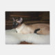 Seal Point Siamese cat keeping warm on a faux white lamb's wool throw blanket on the couch. She's laying so pretty with her tail curled and her stunning blue eyes.
