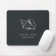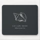 Island chic personalised mousepad for your business or home office features two lines of custom text in classic white lettering, on a soft black background adorned with a tropical conch shell illustration in faux silver foil for a beach glam look.