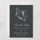 Notify guests of your upcoming destination, beach, or tropical island wedding with these beautiful summer save the date cards featuring a faux silver foil conch shell illustration on a rich, soft black background. Elegant white script and block lettering displays your wedding details (names, wedding date, location, and website).