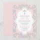 Elegant Silver Cross Pink Damask Baby Girl Baptism Invitation